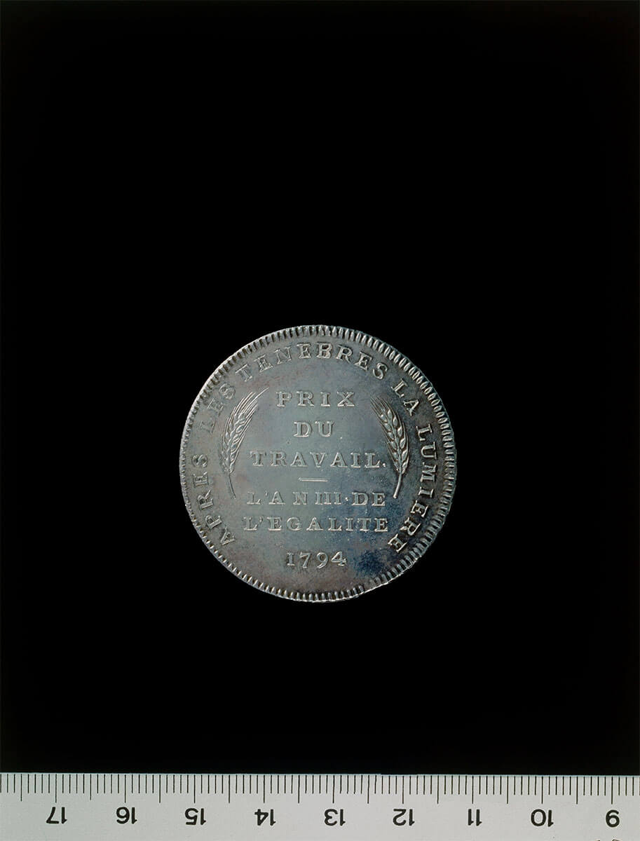 Avers : : REPUBLIQUE GENEVOISE ; EGALITE LIBERTE INDEPENDANCE ; T·B· / Revers : APRES LES TENEBRES LA LUMIERE ; PRIX DU TRAVAIL ; L’AN III DE L’EGALITE 1794
